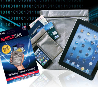 The SHIELDSAK consists of a flexible R.F. shield fabric pouch that will not allow data scans by blocking electronic signals from reaching data transponders.
